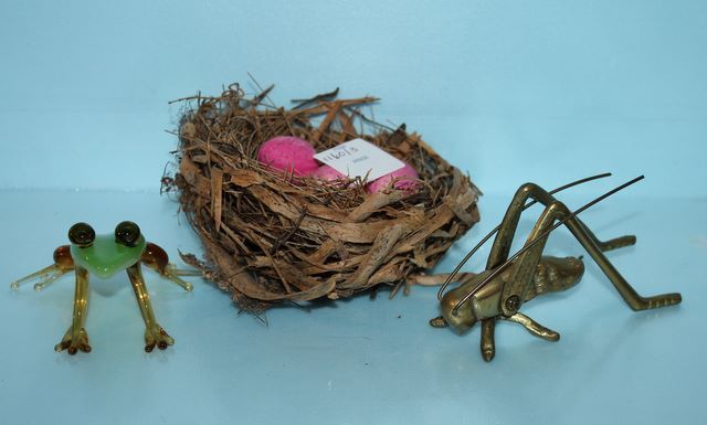 Three Miscellaneous Items; glass and frog, bird nest with eggs, brass grasshopper; animals 2" h. Three Miscellaneous Items; glass and frog, bird nest with eggs, brass grasshopper; animals 2" h.