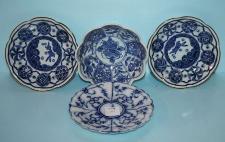 1164 Three Blue and White Small Porcelain Dishes and One Small Bowl