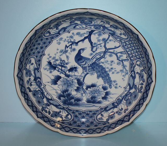 Large Blue and White Porcelain Charger with bird in center; 14 1/2" dia. Large Blue and White Porcelain Charger with bird in center; 14 1/2" dia.