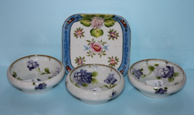 Four Small Hand Painted Dishes; three round with violets, one square with roses; 3 1/2" dia. Four Small Hand Painted Dishes; three round with violets, one square with roses; 3 1/2" dia.