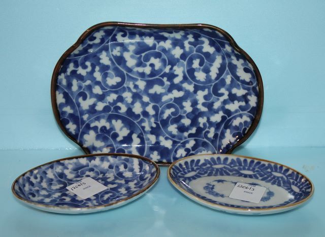 Three Blue and White Trays; two 4 1/2" oval, dish 6" Three Blue and White Trays; two 4 1/2" oval, dish 6"
