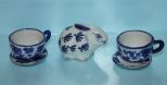 Group of Small Blue and White Porcelain Table Top Pieces; 2 cups 2" and saucers, rabbit 1 1/2" h. Group of Small Blue and White Porcelain Table Top Pieces; 2 cups 2" and saucers, rabbit 1 1/2" h.