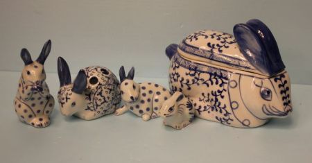 1218 Group of Five Small Blue and White Rabbits and Covered Rabbit Dish