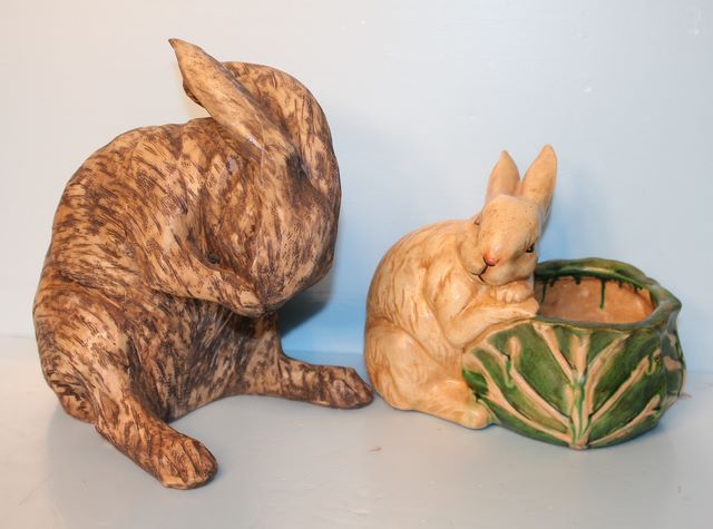 Pottery Bunny Planter 7 1/2" w., 7" h. and Resin Rabbit9 1/2" h. Pottery Bunny Planter 7 1/2" w., 7" h. and Resin Rabbit9 1/2" h.