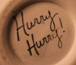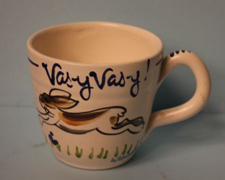 Large Hand Painted Mug with Rabbit and the words Vas-y Vas-y! La Madeline Hurry! Hurry!; 4" h., 4 1/2" dia. Large Hand Painted Mug with Rabbit and the words Vas-y Vas-y! La Madeline Hurry! Hurry!; 4" h., 4 1/2" dia.