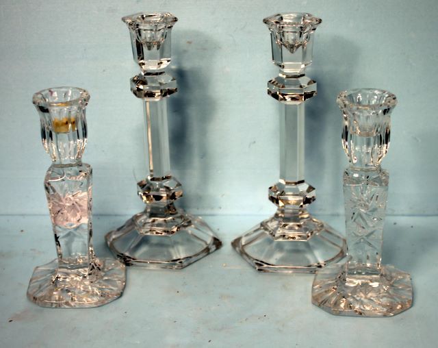 Two Pairs of Crystal Candlestick Holders; 6" h., 7 1/2" h. Two Pairs of Crystal Candlestick Holders; 6" h., 7 1/2" h.