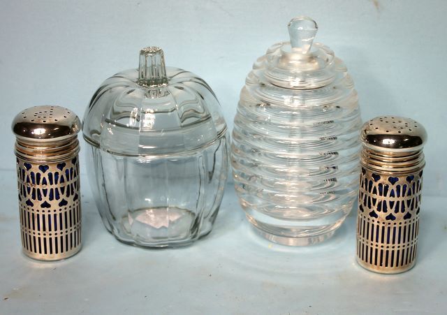 Honeycomb Dish (6 1/2" h.), Pair of Small Covered Dish and Cobalt Salt/Peppers with Silver Liners (4" h.) Honeycomb Dish (6 1/2" h.), Pair of Small Covered Dish and Cobalt Salt/Peppers with Silver Liners (4" h.)