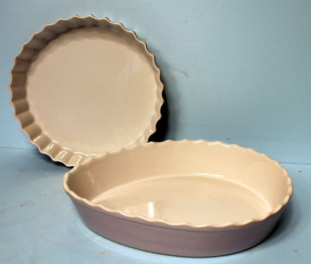 Two Pastel Baking Dishes; 9" dia., 11 1/2" dia. Two Pastel Baking Dishes; 9" dia., 11 1/2" dia.
