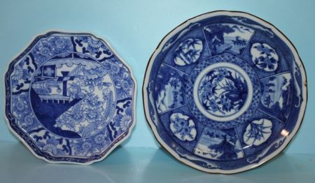 Two Blue and White Porcelain Pieces; octagon shaped dish (7" dia.), round shallow bowl (8 1/2" dia.) Two Blue and White Porcelain Pieces; octagon shaped dish (7" dia.), round shallow bowl (8 1/2" dia.)