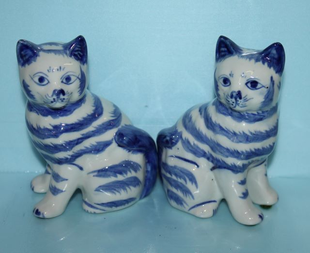 Pair of Small Blue and White Cats" h. Pair of Small Blue and White Cats" h.