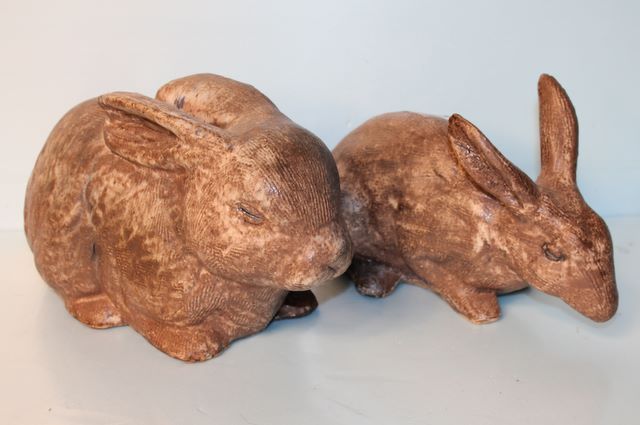 Two Brown Peters Pottery Rabbits; 10" to 11" w., 5 1/2" h. Two Brown Peters Pottery Rabbits; 10" to 11" w., 5 1/2" h.