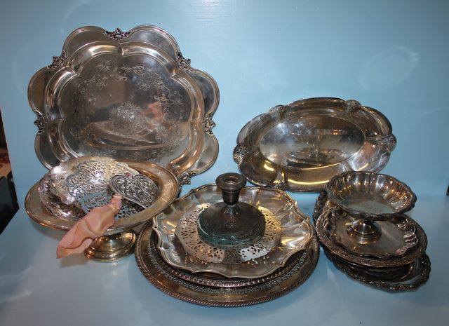 Box Lot of Silverplate; includes trays, trivets, bowls and candlestick, various sizes Box Lot of Silverplate; includes trays, trivets, bowls and candlestick, various sizes