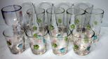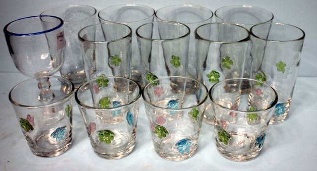 Thirteen Clear Glasses Various Sizes, some with flower decorations; 4" to 6 1/2" Thirteen Clear Glasses Various Sizes, some with flower decorations; 4" to 6 1/2"