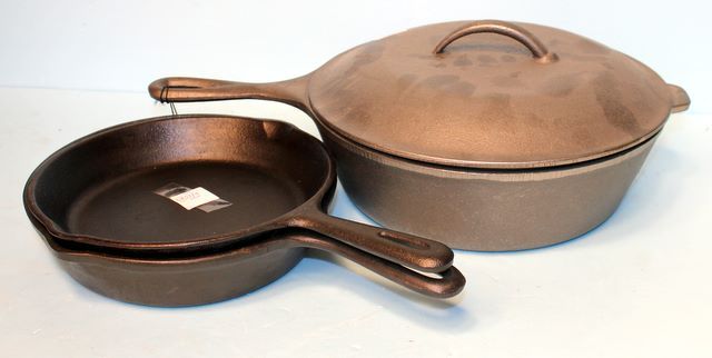 Three Cast Iron Skillets, one with lid 12" dia., two 8" dia. Three Cast Iron Skillets, one with lid 12" dia., two 8" dia.