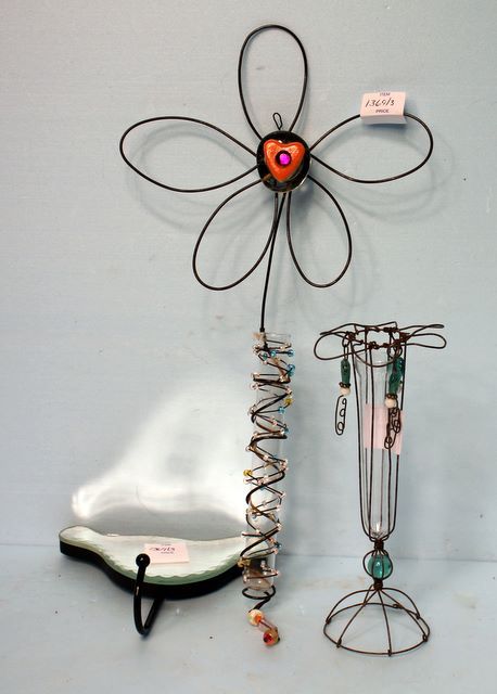 Three Decorative Items; includes wire vase, wire flower with face, and bird mirror (hook); 6" h. Three Decorative Items; includes wire vase, wire flower with face, and bird mirror (hook); 6" h.