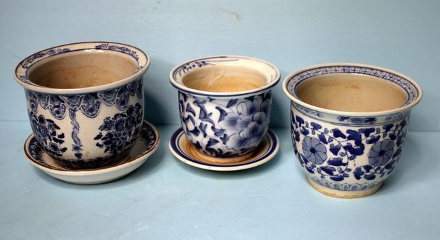 Group of Three Blue and White Chinese Import Flower Pot Holders; 5" dia., 4" h. Group of Three Blue and White Chinese Import Flower Pot Holders; 5" dia., 4" h.