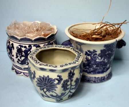 Three Blue and White Flower Pot Holders; two 4 1/2" one 5 1/2" dia. Three Blue and White Flower Pot Holders; two 4 1/2" one 5 1/2" dia.