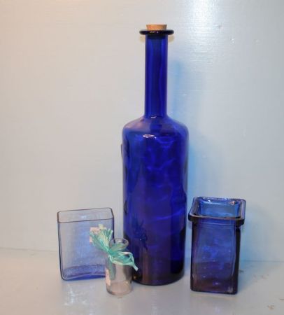 Four Glass Items; tall cobalt bottle; 3 1/2" to 16" h. Four Glass Items; tall cobalt bottle; 3 1/2" to 16" h.