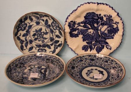 Four various Blue and White Pieces; three plates (8" dia.) and one fluted plate (9" dia.) Four various Blue and White Pieces; three plates (8" dia.) and one fluted plate (9" dia.)