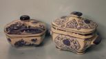 Two Blue and White Covered Jars; 5"- 6" w. Two Blue and White Covered Jars; 5"- 6" w.