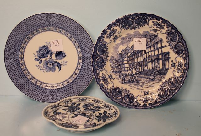Three Blue and White Pieces; two plates (8" dia.), and a cloverleaf shaped dish (6" w.) Three Blue and White Pieces; two plates (8" dia.), and a cloverleaf shaped dish (6" w.)