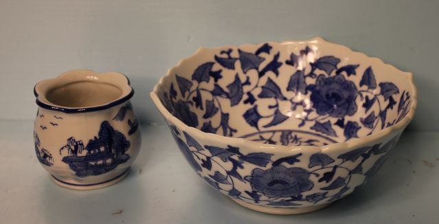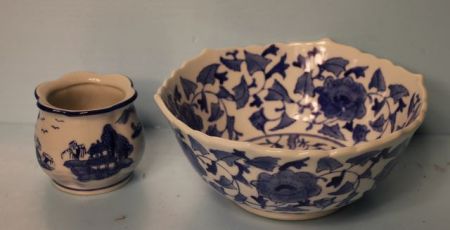 Two Blue and White Porcelain Pieces; a bowl (8" dia.) and small vase (2 1/2" dia.) Two Blue and White Porcelain Pieces; a bowl (8" dia.) and small vase (2 1/2" dia.)