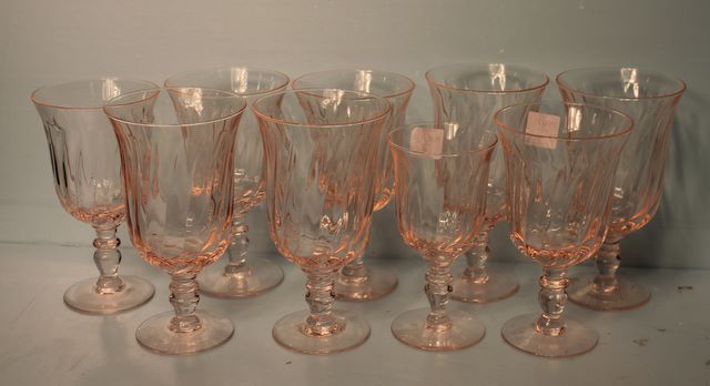 Nine Pink Glasses in Various Sizes; 6" - 7" h. Nine Pink Glasses in Various Sizes; 6" - 7" h.