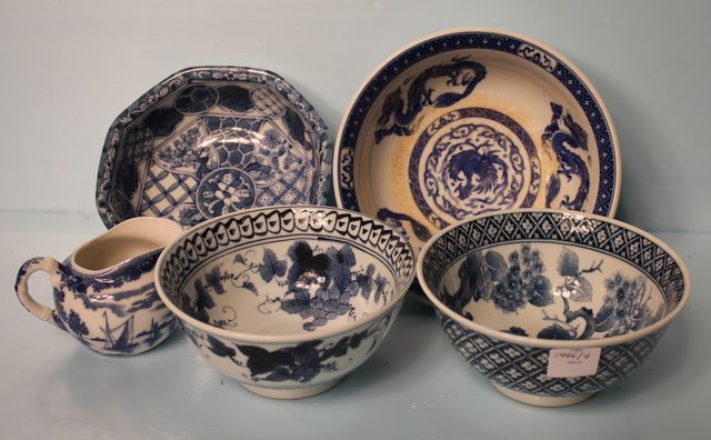 Four Blue and White Pieces; three bowls (5 1/2" - 6 1/2" dia.) and one creamer (3" h.) Four Blue and White Pieces; three bowls (5 1/2" - 6 1/2" dia.) and one creamer (3" h.)