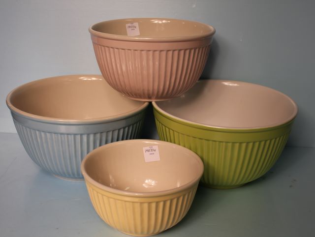 Four Williams-Sonoma Bowls; yellow, pink, blue, green; 7" - 10" dia. Four Williams-Sonoma Bowls; yellow, pink, blue, green; 7" - 10" dia.