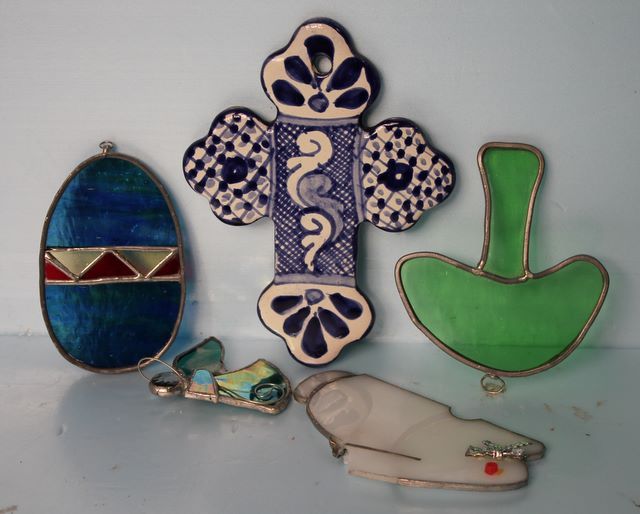 Box of Small Stain Glass Pieces and Blue and White Porcelain Cross; 2" to 5" Box of Small Stain Glass Pieces and Blue and White Porcelain Cross; 2" to 5"