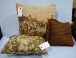 Three Pillows Machine Stitch Pillow featuring a hunt scene, rectangular shape green floral throw pillow, small brown tone on tone pillow Three Pillows Machine Stitch Pillow featuring a hunt scene, rectangular shape green floral throw pillow, small brown tone on tone pillow