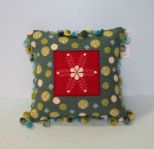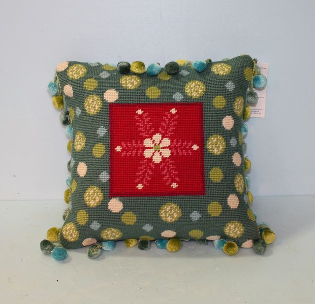 Small Needlepoint Throw Pillow, floral snowflake pattern with blue and green pom pom trim Small Needlepoint Throw Pillow, floral snowflake pattern with blue and green pom pom trim
