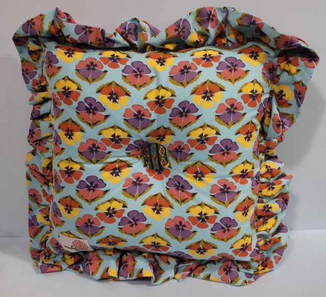 Large Floral Pattern Throw Pillow in bright vivid colors; button tuft center; 23" dia. Large Floral Pattern Throw Pillow in bright vivid colors; button tuft center; 23" dia.