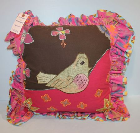 Large Brown Throw Pillow with bright color ruffled border and machine stitch bird in center; 25" dia. Large Brown Throw Pillow with bright color ruffled border and machine stitch bird in center; 25" dia.