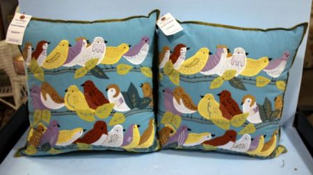 Pair of Blue Throw Pillows with hand stitched appliqued birds; 18" dia. Pair of Blue Throw Pillows with hand stitched appliqued birds; 18" dia.