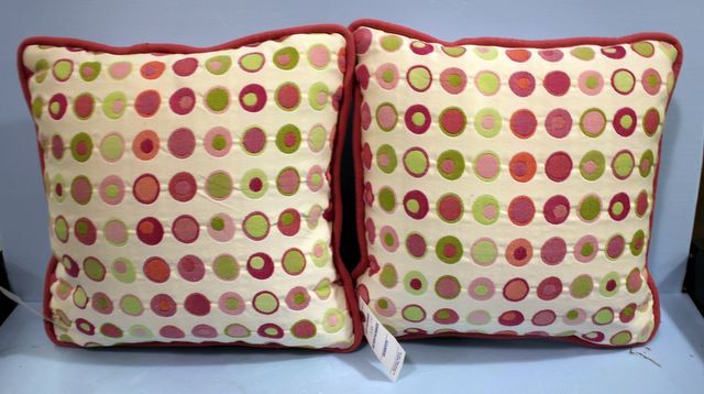 Pair of Geometric Pattern Throw Pillows in bright pink and green colors; 15 1/2" dia. Pair of Geometric Pattern Throw Pillows in bright pink and green colors; 15 1/2" dia.