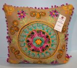 Burlap Fabric Karma Living Accent Pillow with fuchsia pom pom trim; 16" x 16" Burlap Fabric Karma Living Accent Pillow with fuchsia pom pom trim; 16" x 16"