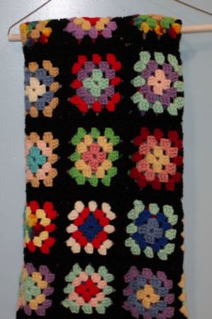 Bright Multi-Crochet Throw with black background; 44" w., 92" l. Bright Multi-Crochet Throw with black background; 44" w., 92" l.