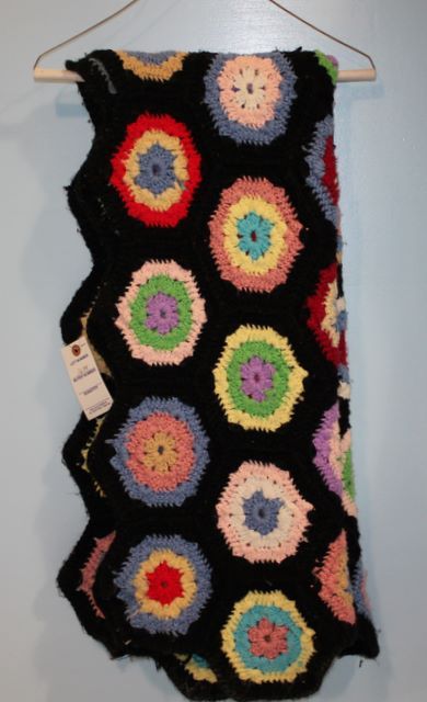 Multi-color Crochet Throw with black background; 46" w., 56" l. Multi-color Crochet Throw with black background; 46" w., 56" l.