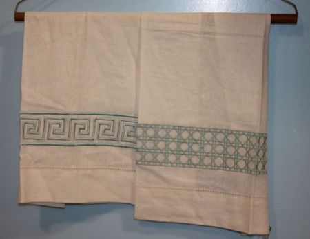 Two Linen Blend Tea Towels with seafoam green geometric design; 14" w., 22" l. Two Linen Blend Tea Towels with seafoam green geometric design; 14" w., 22" l.