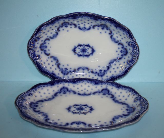 Two Flow Blue Platters, antique, no chips or cracks; one 11" w., one 12" w. Two Flow Blue Platters, antique, no chips or cracks; one 11" w., one 12" w.