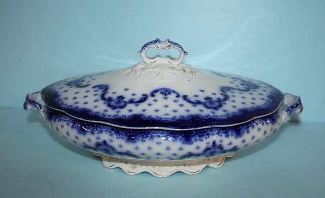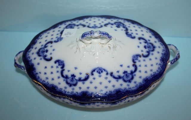 Flow Blue Covered Tureen, antique, no chips or cracks; 10" dia. Flow Blue Covered Tureen, antique, no chips or cracks; 10" dia.