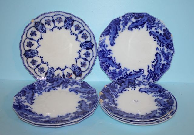 Six Flow Blue Plates, antique, all having chips; 8 1/2" dia. Six Flow Blue Plates, antique, all having chips; 8 1/2" dia.