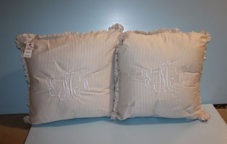 Pair of Euro Pillows with brown/white stripe Euro shams; monogram SMW Pair of Euro Pillows with brown/white stripe Euro shams; monogram SMW
