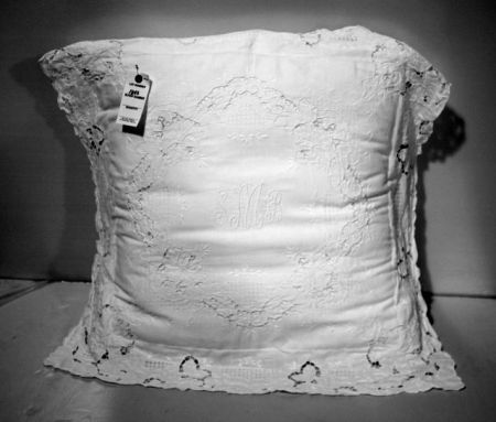 Euro Pillow with intricate cutwork design. White with monogram "SMB" Euro Pillow with intricate cutwork design. White with monogram "SMB"