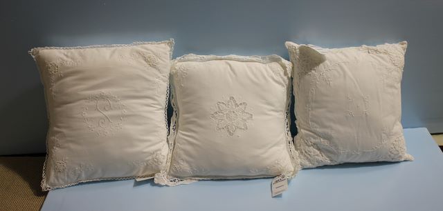 Three Square Accent Pillows with cutwork detail, white cotton shams Three Square Accent Pillows with cutwork detail, white cotton shams