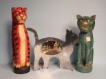 Metal Cat Picture Frame and Two Wooden Cat Figurines; tallest 16" h. Metal Cat Picture Frame and Two Wooden Cat Figurines; tallest 16" h.