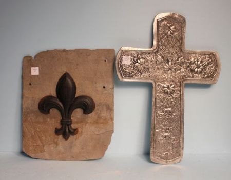 Two Decorative Pieces, fleur-de-lis on slate and metal decorative cross (19 1/2" x 13 1/2") Two Decorative Pieces, fleur-de-lis on slate and metal decorative cross (19 1/2" x 13 1/2")