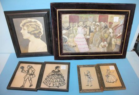 Hand Colored Victorian Print "Christmas Gathering" 16"w., 13"h., and Two Vintage Lady/Gent Prints and Mary Pickford Picture, and Pair of Stitch work Couple Hand Colored Victorian Print "Christmas Gathering" 16"w., 13"h., and Two Vintage Lady/Gent Prints and Mary Pickford Picture, and Pair of Stitch work Couple