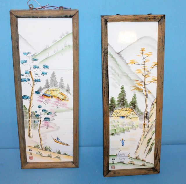 Pair of Framed Oriental Scene Tiles. Pair of Framed Oriental Scene Tiles.